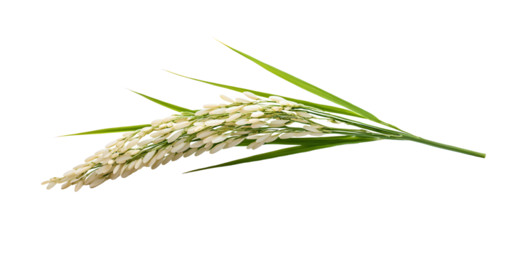 against a stark white background, a detailed shot presents a single spikelet adorned with grains, accompanied by a few linear leaves