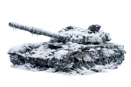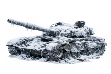 Destroyed tank covered in snow and ice isolated