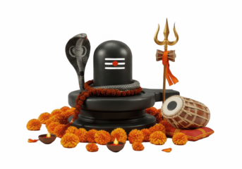 Hindu God Shiva Symbols – Realistic Shivling Setup with Trident, Naga, Damru, and Prayer Flowers for Maha Shivratri