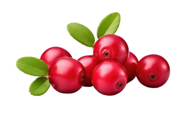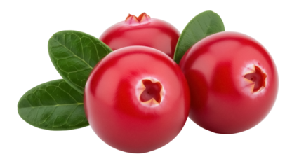Three vibrant red cranberries with green leaves isolated PNG, fresh lingonberries on transparent background for healthy eating and festive designs