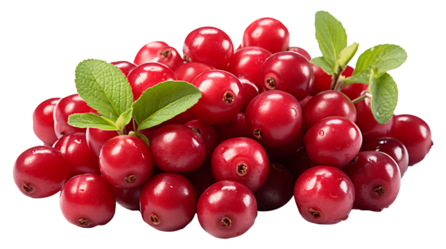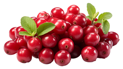 Juicy red lingonberries with vibrant green foliage on a transparent background, PNG image, PNG file