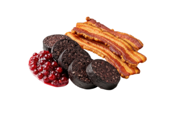 Pan-fried blood pudding, crispy bacon, vibrant lingonberry jam on a white plate, isolated on transparent, soft studio lighting, macro lens, authentic Swedish food concept