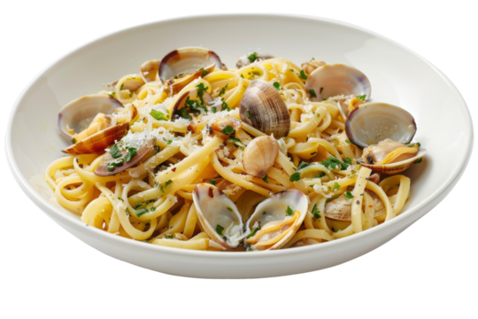 Fresh linguine tossed with clams, garlic, and parsley, served in a white bowl with a sprinkle of parmesan cheese.