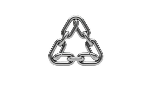 Three interconnected silver metallic chain links displayed horizontally against a black background with subtle rainbow reflections on the surface creating a modern abstract design