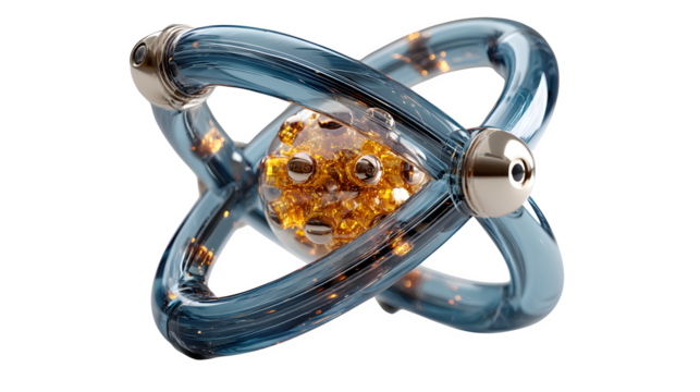 A glowing 3D atom icon with orbiting electrons, representing science and innovation, set against white --ar 16:9 --v 7.0 --s 750