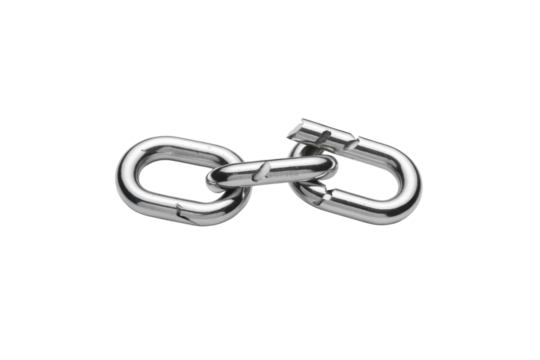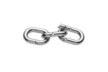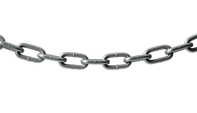 A close-up shot of a metallic chain suspended against a black background. The chain links are interlocked and reflective
