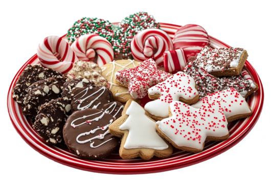 An assortment of festive holiday treats including gingerbread cookies and peppermint bark displayed on a festive platter. On a transparent background