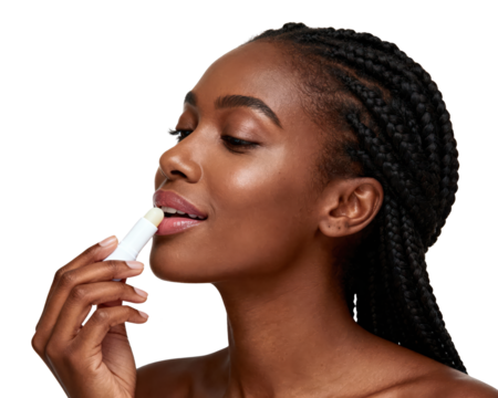 Close up view of a woman applying lip balm to chapped lips, emphasizing beauty and healthcare themes while set against a transparent background, highlighting skincare and hydration
