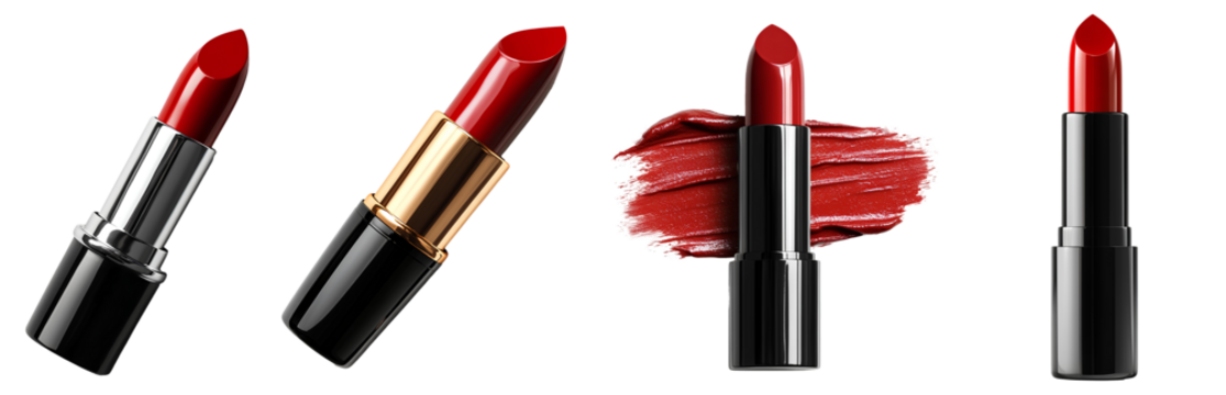 Luxurious red lipsticks in sleek black and gold tubes premium beauty cosmetics transparent background