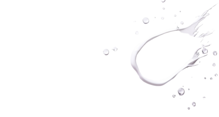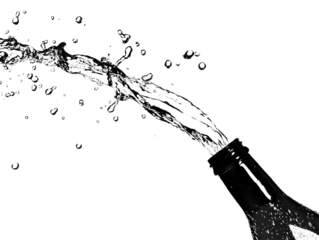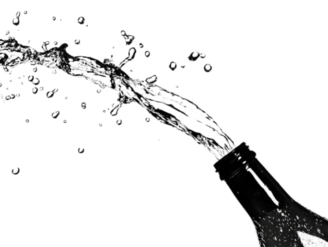 Dynamic splash of liquid bursting from a bottle, creating an arc of droplets against a stark white background