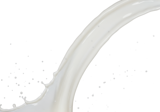 High-viscosity, opaque white milk or cream forms an elegant, upward-surging stream with fine micro-droplets on a transparent background. Concept for dairy advertising