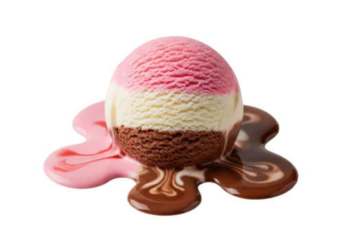 Single scoop Neapolitan ice cream, strawberry, vanilla, chocolate layers, melting into blending puddles on transparent background, studio lighting, close-up macro, food photography concept
