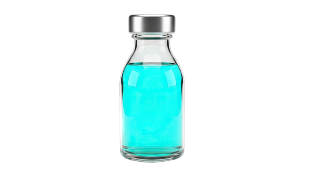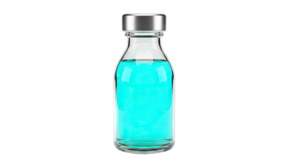 Clear Glass Vial With Vibrant Aqua Blue Liquid and Silver Cap Isolated on Transparent Background Pharmaceutical Medical Concept