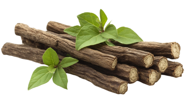 Licorice wooden dry roots  for medical herb with fresh vibrant green leaves isolated on white background. Suitable for marketing or business purposes. PNG file