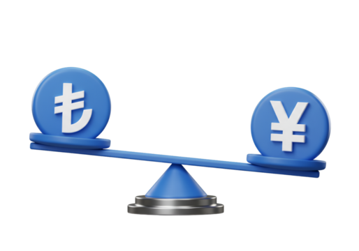 3D Render Illustration of Balance Scale with Yen and Turkish Lira Symbols