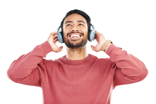 Headphones, happy and man with smile for music on isolated png or transparent background. Podcast subscription, technology and male person listen to audio, streaming radio and track online to relax