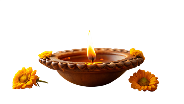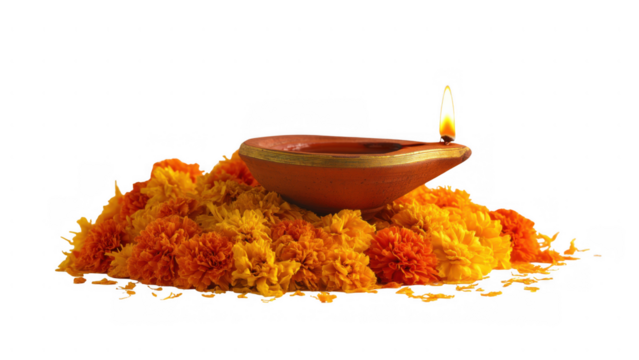Lit Clay Diya with Marigold Flowers on Transparent Background