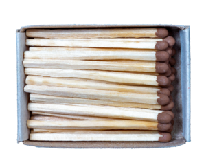 Open box of matches with red tips and wooden sticks on background isolated on a transparent background