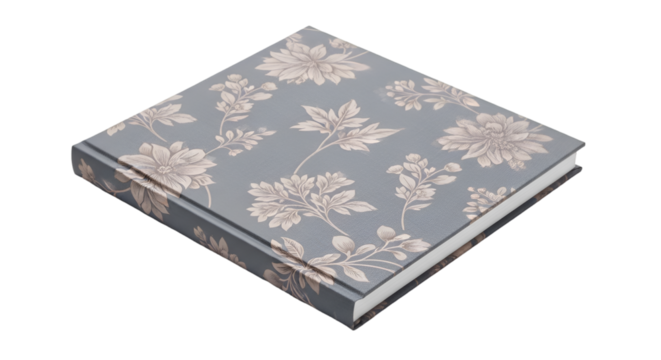Vintage leather book cover with ornamental embossed border, resting on transparent surface, ready for graphic design application