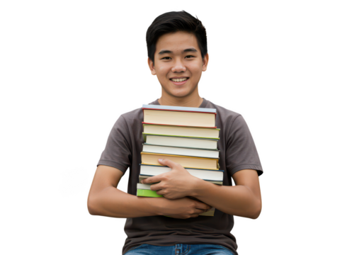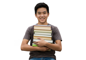 Smiling asian student holding books isolated on transparent background