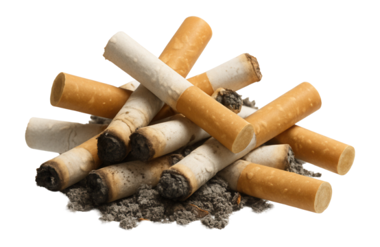 collection of dirty and discarded cigarette butts representing pollution and smoking addiction