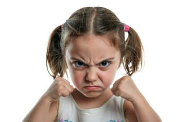An angry little girl with clenched fists and furrowed brows, expressing her emotions.