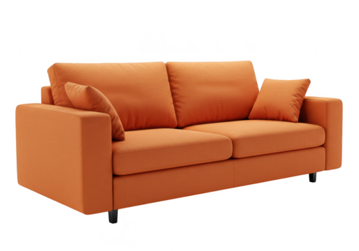 A modern orange upholstered two-seater sofa with matching cushions isolated on transparent background