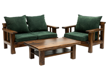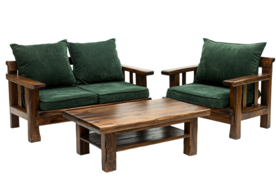 Dark wooden sofa set with green cushions and a matching coffee table