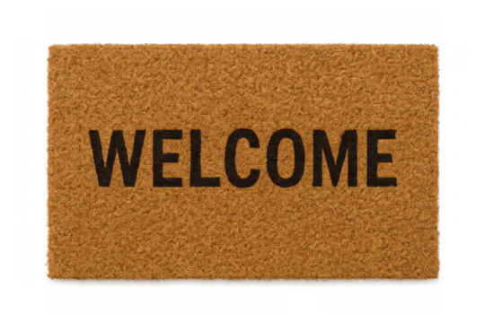 Welcome doormat creating a friendly entrance to home, displaying text on brown coir rug, isolated with transparent background