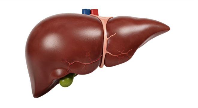detailed human liver isolated on white background, depicting anatomy, digestive system, and medical education in a realistic biological illustration style