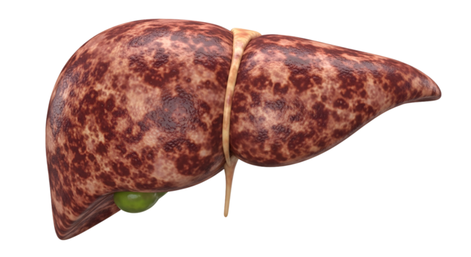 A realistic 3d illustration of a diseased human liver, isolated on transparent background