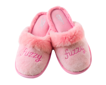 Pair of pink fuzzy slippers with fuzzy text isolated on transparent background
