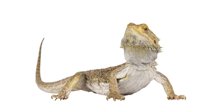 A close-up of a bearded dragon lizard looking upward,cutout on transparent backgrounds.
