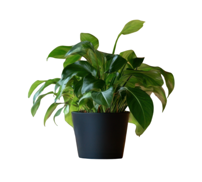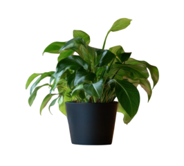 Lush green spathiphyllum peace lily flourishing in a modern black planter, set against a clear backdrop for creative projects