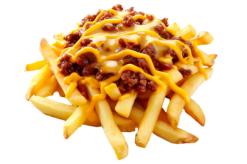 Crispy Chili Cheese French fries isolated on white transparent background, perfect for snacking, quick and tasty treat