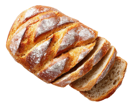 Rustic sourdough bread loaf isolated on transparent background. Slice of bread top view isolated on white background.