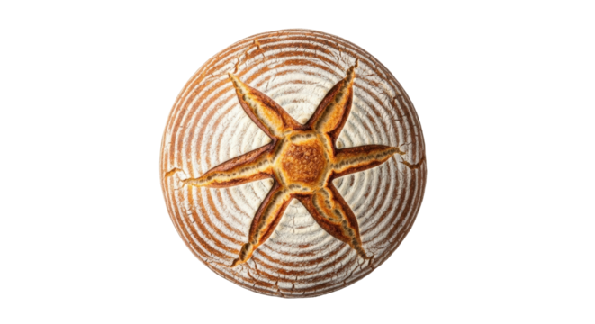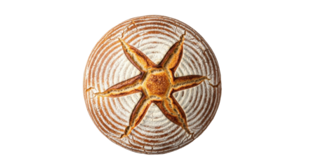 Isolated sourdough bread round loaf with star crust scoring design on baked artisan bread
