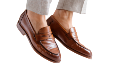 Elegant brown leather loafers worn with light-colored trousers, white isolate background.