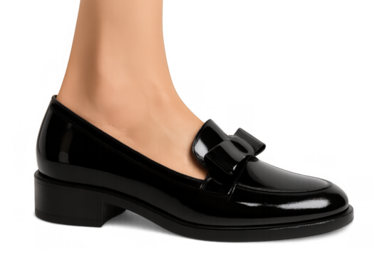 Woman wearing black patent leather loafer shoe with bow detail, capturing elegance and classic fashion on transparent background