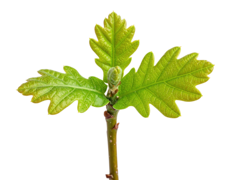 A vibrant green oak leaf branch isolated on a transparent background, showcasing the intricate details of its lobed leaves and natural growth pattern