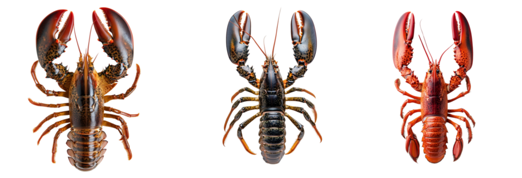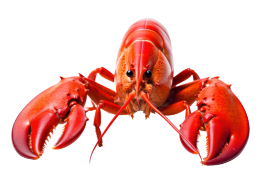 A close-up photo of a fresh, vibrant lobster with its claws open, isolated on a white background