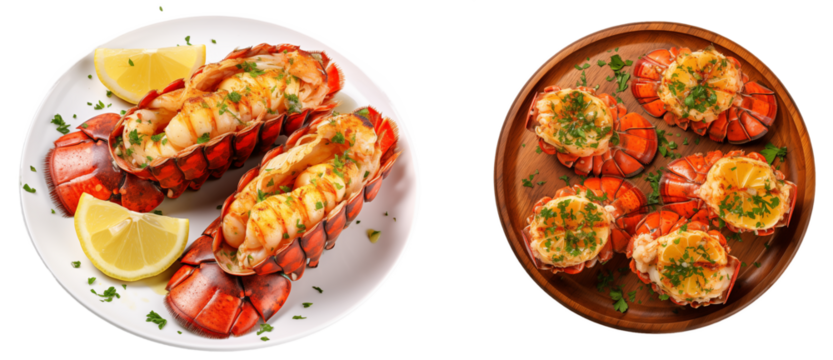 Grilled lobster tails with garlic butter bundle isolated on white background