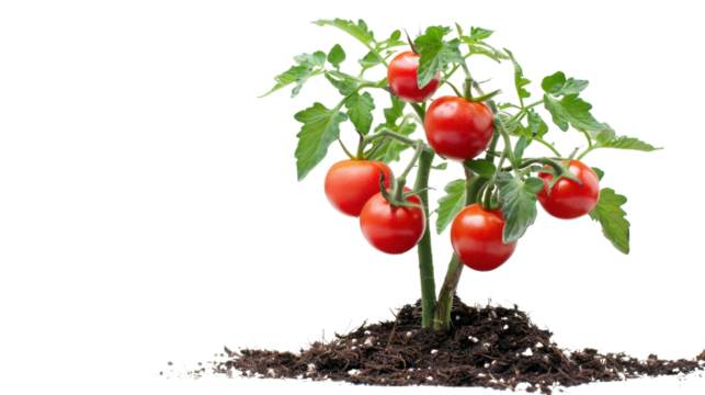 Fresh cherry tomato plant growing in soil on transparent background