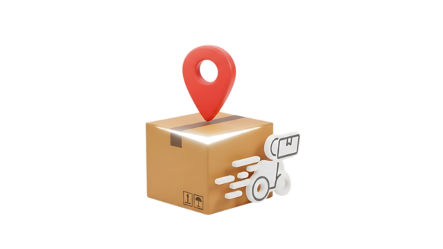 A cardboard box with a red location pin on top isolated on transparent background