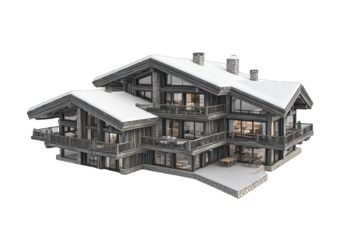 Stylish modern chalet surrounded by snow, featuring wooden architecture and large windows, perfect for winter retreats or vacation.