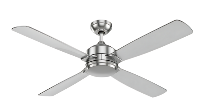 Modern sleek silver ceiling fan with four blades on a black background