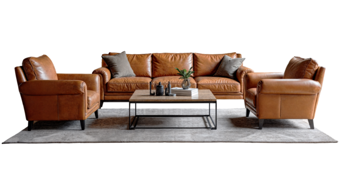 Industrial loft style sofa armchairs and table for living room. Isolated PNG