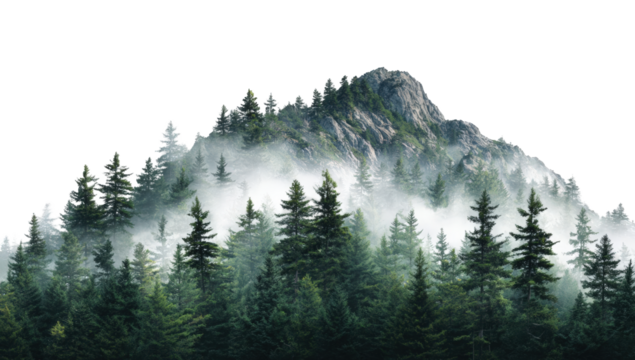 Mountain range, majestic with green rolling hills and pine forest, cutout, PNG isolated on white or transparent background
