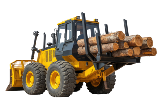 Powerful yellow and black logging machine, possibly a forwarder, loaded with multiple cut wooden logs for timber transportation. background removed