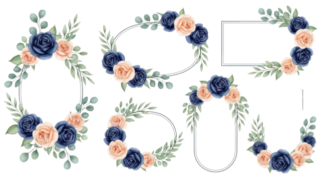 Set of watercolor floral frame bouquets of navy and peach roses and leaves. Botanic decoration illustration for wedding card, fabric, and logo composition